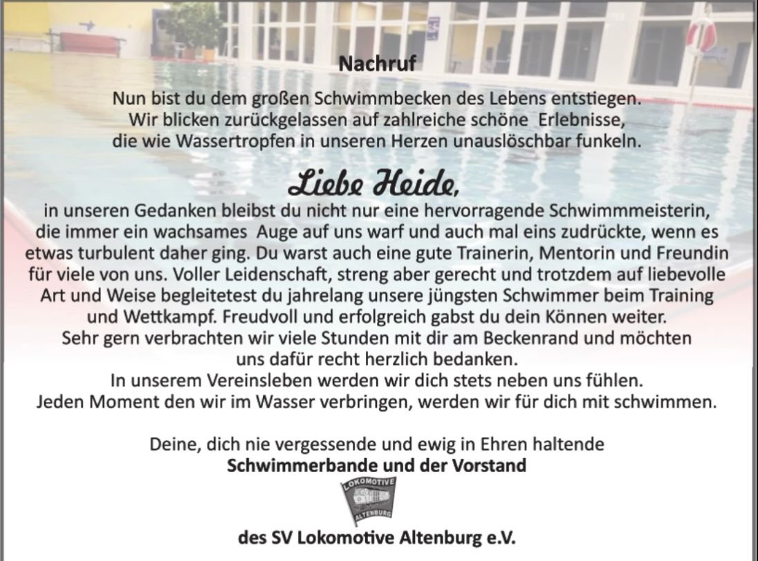 Selten gelingt einem Schwimmer, auch wenn er noch so erfolgreich war, seinem eigenen Kind das Schwimmen zu erlernen. Aber das brauchte er auch nicht, dafür hatten wir unsere Heide. Sie ,,wartete" regelrecht darauf, um einzuspringen, wenn wir dabei an unsere Grenzen stießen. Ruhigen Gewissens vertrauten wir ihr unsere ,,Schwimmer-Kinder" an. Wir wussten sie in liebevolle Hände zu geben und dass Heide das schafft, woran wir scheiterten. Sie gab unseren Kindern nicht nur den letzten Schliff, um sicher zu schwimmen, sondern trainierte sie anschließend mit Herz und Seele im Verein. Über jede abgelegte Schwimmstufe freute sich Heide genau so riesig, wie die kleinen Schwimmer sich selbst und strahlte mit ihnen, dass die Halle erleuchtete. Dafür und für noch viel mehr möchten wir unserer Heide ganz ganz lieb Danke sagen. Wir werden sie stets in guter Erinnerung in unseren Herzen bewahren.
